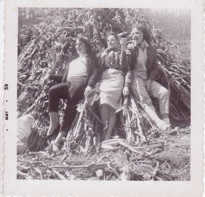 Mom, Hilberta and Gerry.Bonnie, Hilberta and Mom leaning in the corn. Not sure what they are pointing at, but if my mother is anything like her granddaughters then they are not pointing at anything! The pointing and looking is all to make the photo look interesting. My how times do not change at all!